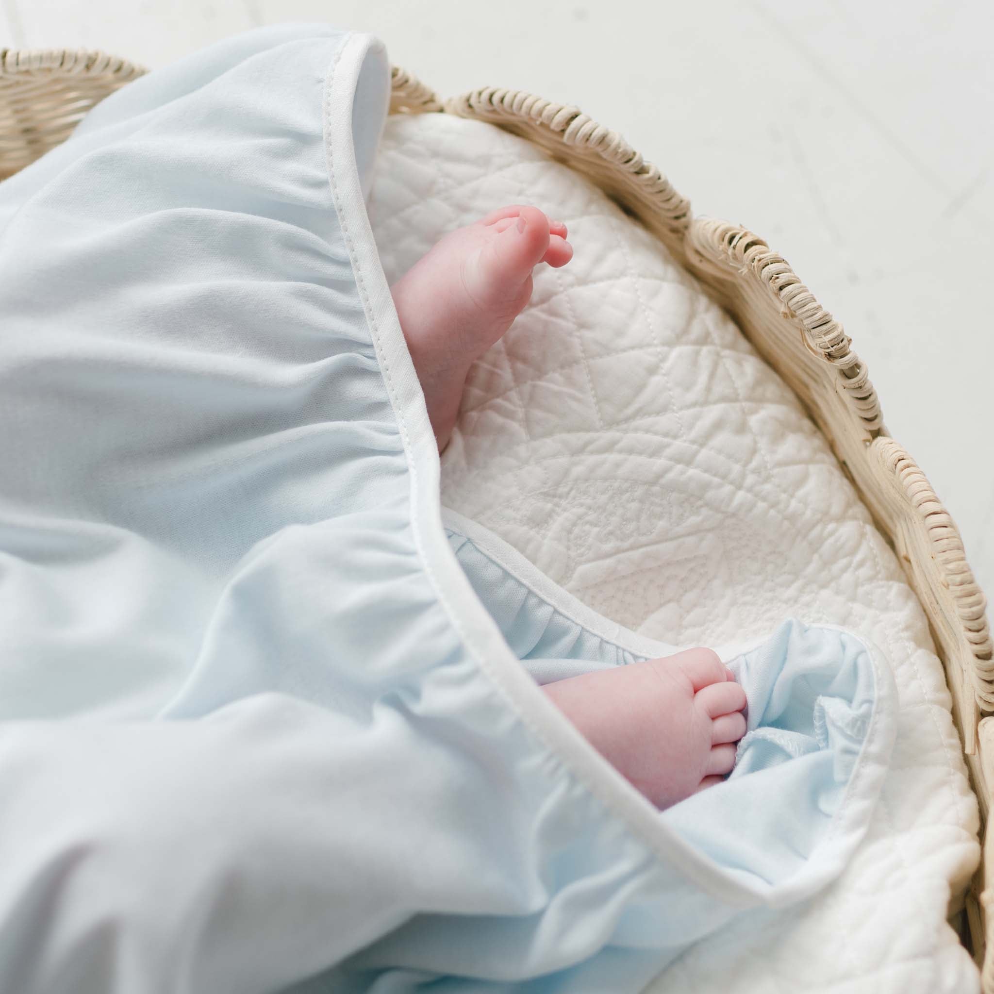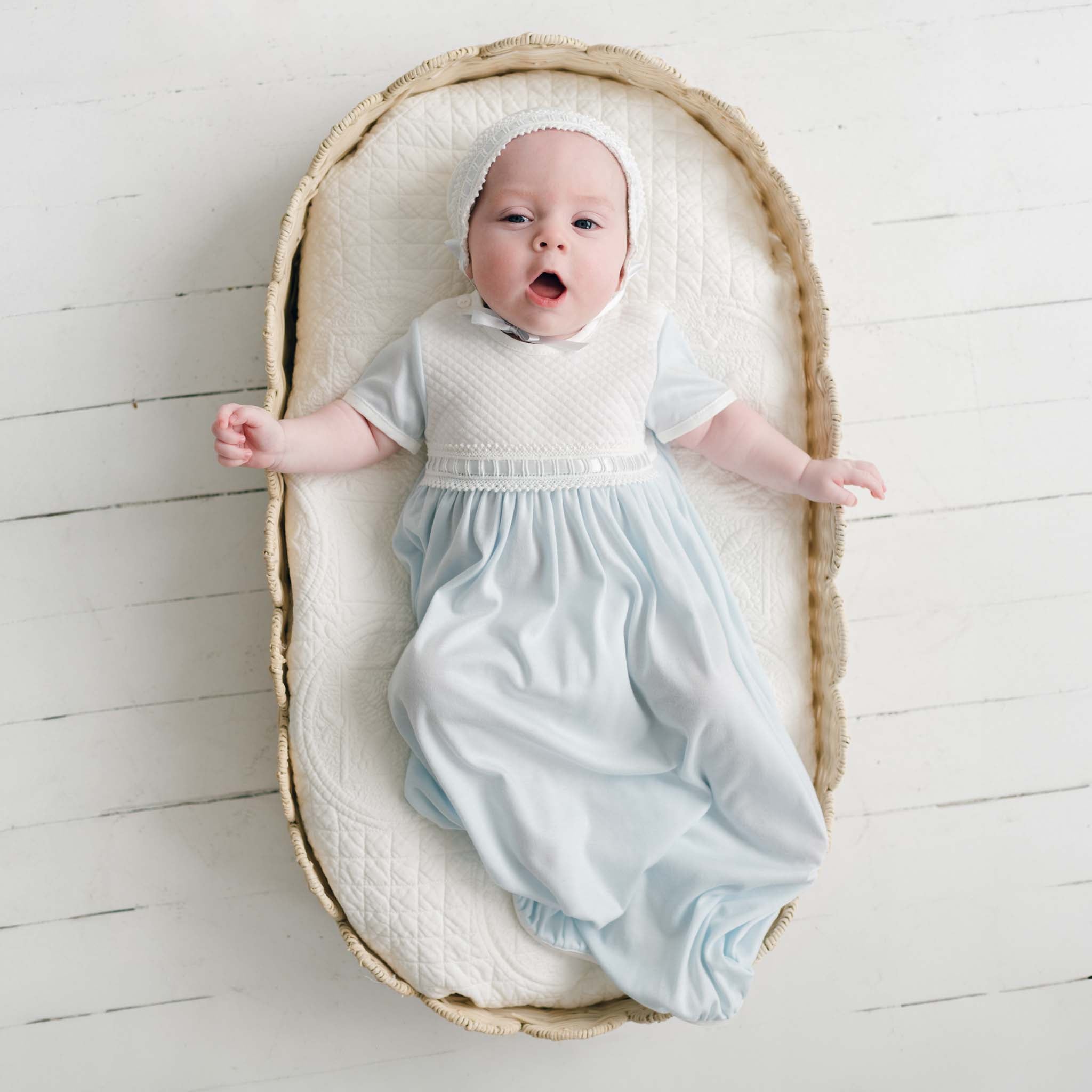 When looking for a newborn coming home gown for boys, comfort and style are essential. The Ethan newborn gown is made with soft pima cotton in powder blue, and features a plush light ivory quilt bodice that was selected with baby's comfort in mind. The ivory lace and blue silk ribbon accent along the bodice adds a subtle special detail that is not found in most newborn baby boys outfits. Light ivory linen trim adds the perfect princely touch. This classic baby gown is as stylish as it is functional-the open skirt design keeps baby covered while also allowing easy diaper changes. It also makes this a perfect bris outfit. Add his newborn baby booties or matching quilted cotton bonnet for a complete outfit that is as sweet as he is.