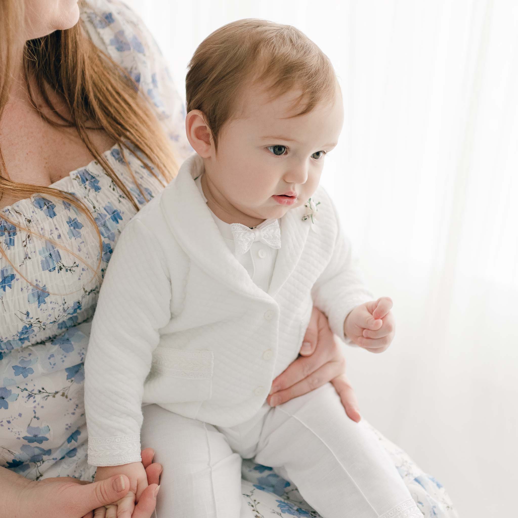 This cozy and chic 3-piece suit is perfect for your precious baby boy's special day. The shorts and pants feature a delicate white linen blend, accented with a charming button detail at the waist and Venice lace along the hem. A comfortable elastic waistband ensures an easy fit. The white quilted cotton jacket is super plush and adorned with matching lace trim on the cuffs and pockets. The white cotton/rayon blend shirt underneath is also delightfully soft, ensuring your little one's comfort throughout the day. This outfit is ideal for special occasions like weddings, baptisms, christenings, or first birthday celebrations. Your handsome young man will surely make a stylish statement in all those photographs you capture.
