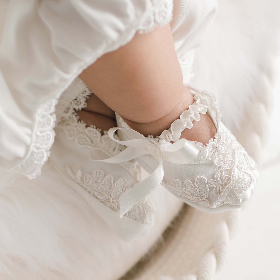 A little bit of luxury for baby. These silk booties are super soft on her little feet. Ivory and champagne embroidered netting scallop across the toe make these booties as beautiful as they are comfortable. The satin bows at sides add the elegant finishing touch not usually found on baby clothes. Soft elastic covered in silk ribbon provides a great fit.