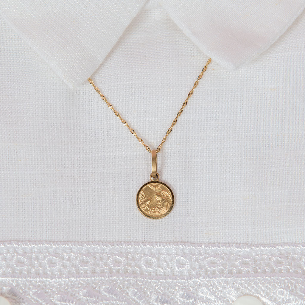 A beautiful gold charm necklace that he will cherish from their Christening day. Made with 14K solid gold, this round gold charm features an intricate religious scene. Includes a delicate 14" 14k gold chain necklace that is the perfect length for infants, but will still fit for years to come. A true heirloom Christening gift that will be kept for years.