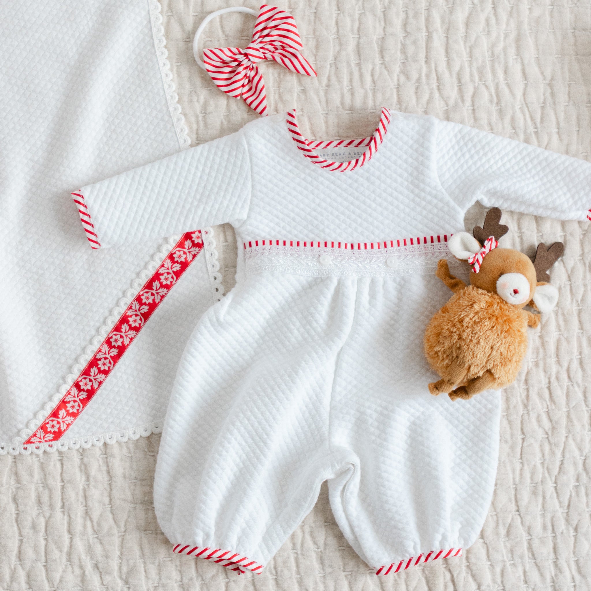 This receiving blanket will keep your little one very comfortable on throughout the Holidays! Made with a very soft 100% ivory quilted cotton with a scalloped cotton edge lace. One corner features a sweet holly and vine red and white ribbon for a lovely detail. A beautiful heirloom piece to add to their holiday outfit.