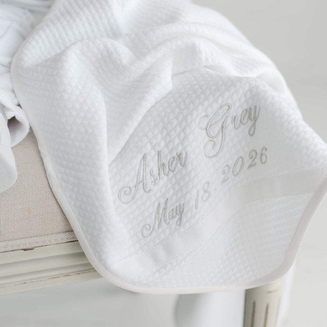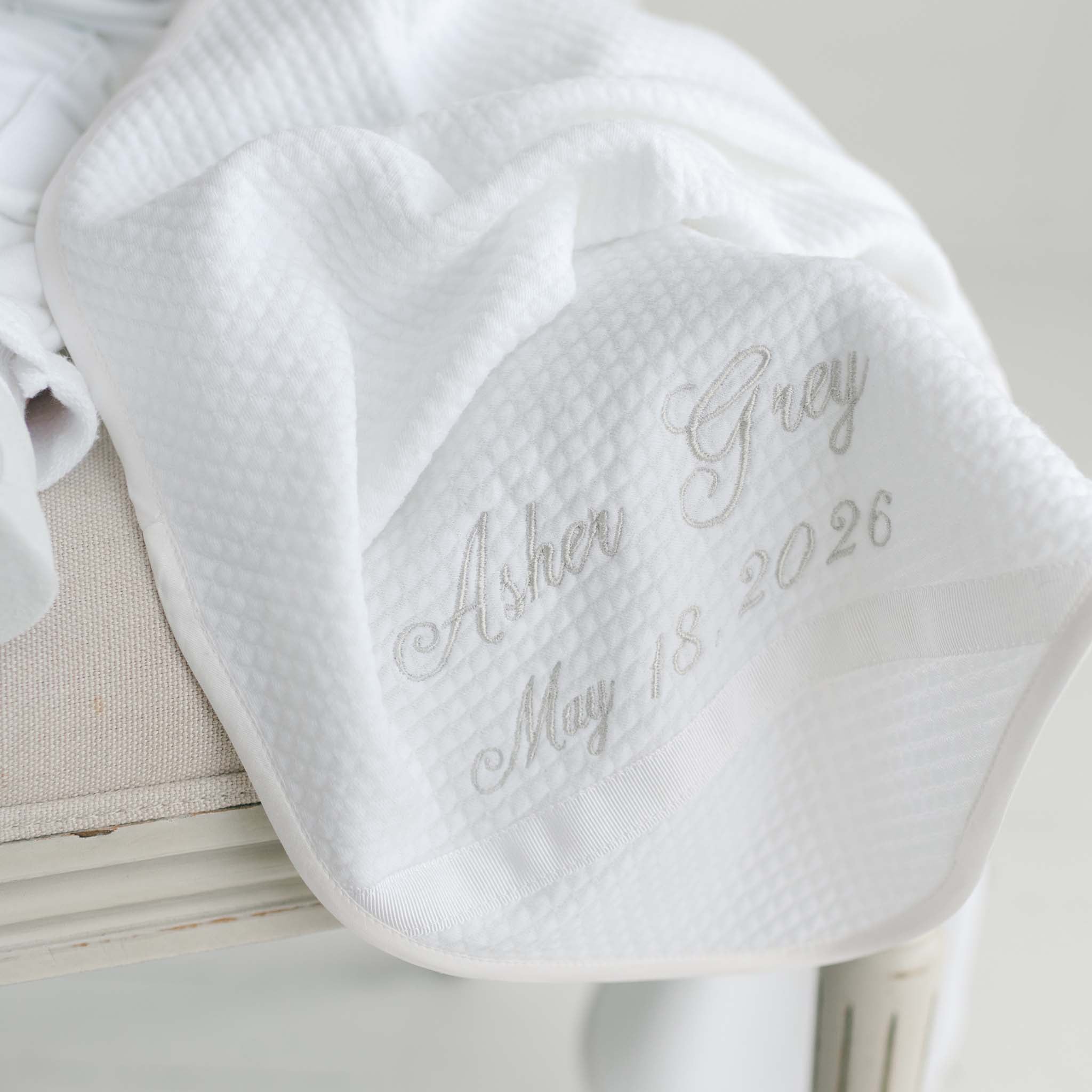 A perfect blanket for their special day! Our Asher personalized blanket has the options to be embroidered with baby's name or name and special date in silver thread. Made in white cotton, trimmed in white silk to match his Asher suit. A exquisitely unique Baptism gift.
