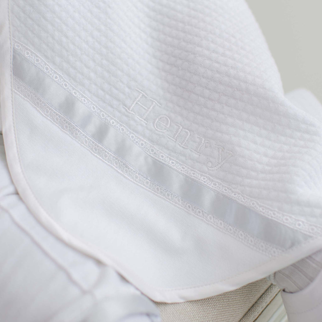 Wrap him up in the best. Our Henry blanket is made with a plush quilted white cotton to keep him cozy and warm, and is trimmed with white silk. The accent corner features our  white venice lace and french terry cotton adding a touch of elegance. You have the option to have his name embroidered in white thread on the accent corner, making this a personalized baby blanket that he will cherish for years. This makes a sweet baby shower gift, but can also be used to keep him warm and styled on a special occasion such as coming home from the hospital or for use during a baptism.