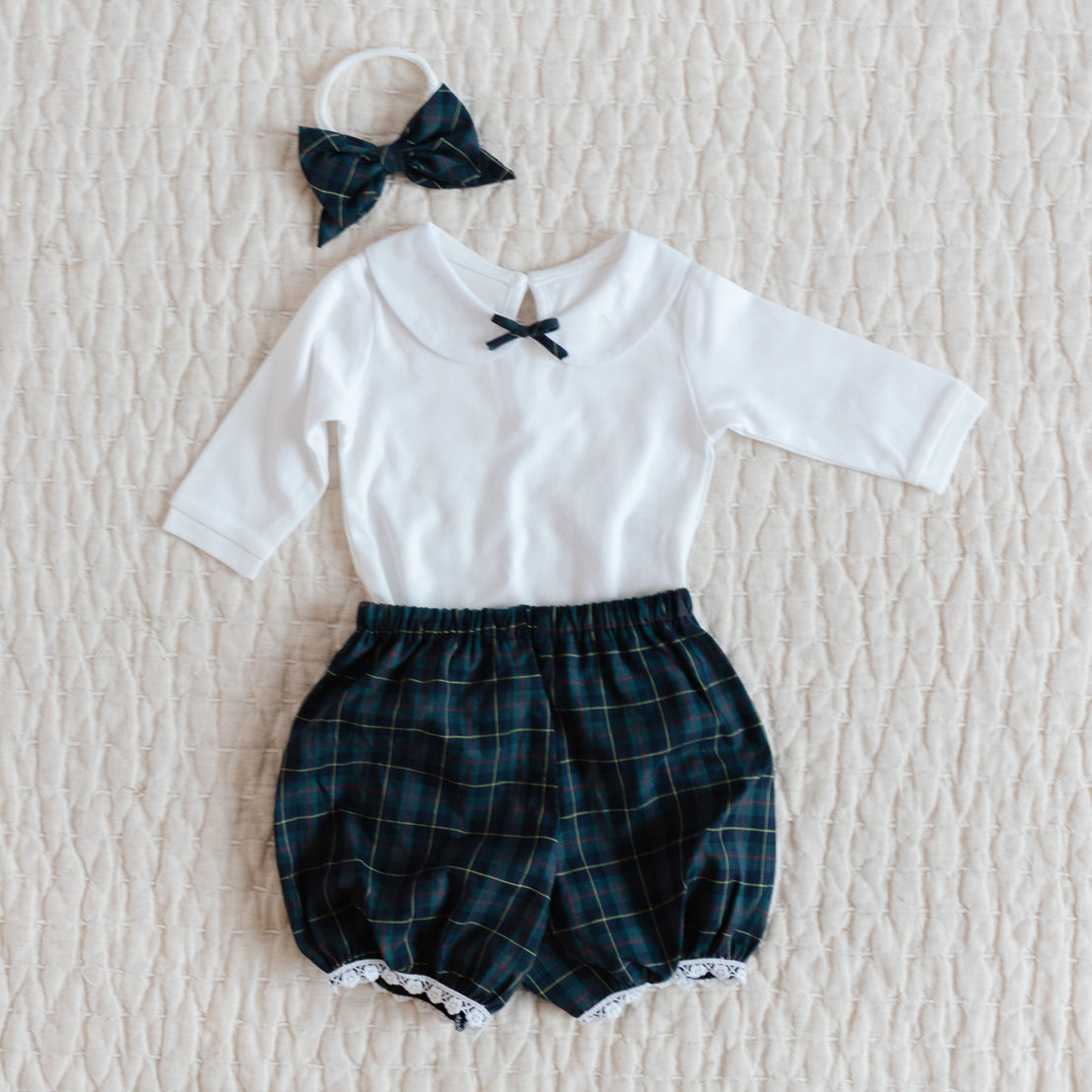 A cozy plaid patterned bloomer and bodysuit will be perfect for all her Holiday events! Adorable blue plaid cotton bloomers, the legs are trimmed with white cotton lace for a sweet detail, elastic in the waist allows for an easy and comfortable fit. Set includes a rounded collar bodysuit set with snaps and matching blue plaid skinny bow detail on the collar. Pair with her matching blue plaid cotton bow headband to complete her look!