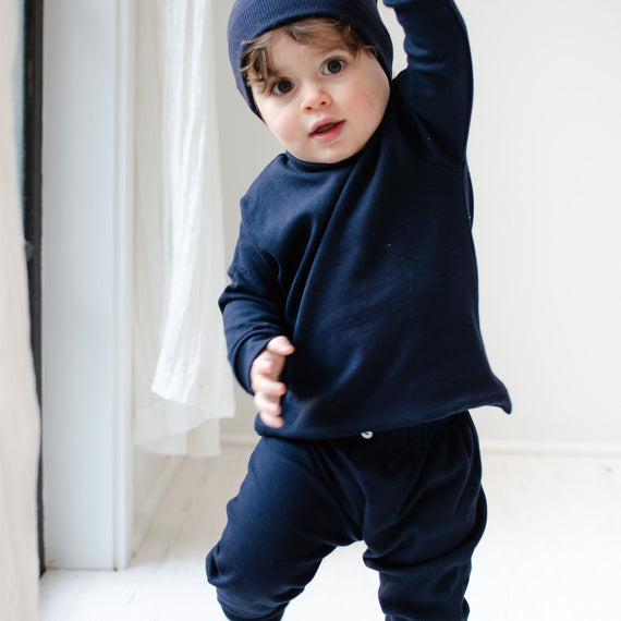 Baby boy sitting on the Elliott Blanket and wearing the navy ribbed cotton top and leggings (and Navy Ribbed Pima Beanie). The top and leggings are made out of 100% ribbed textured cotton with button detail on leggings.