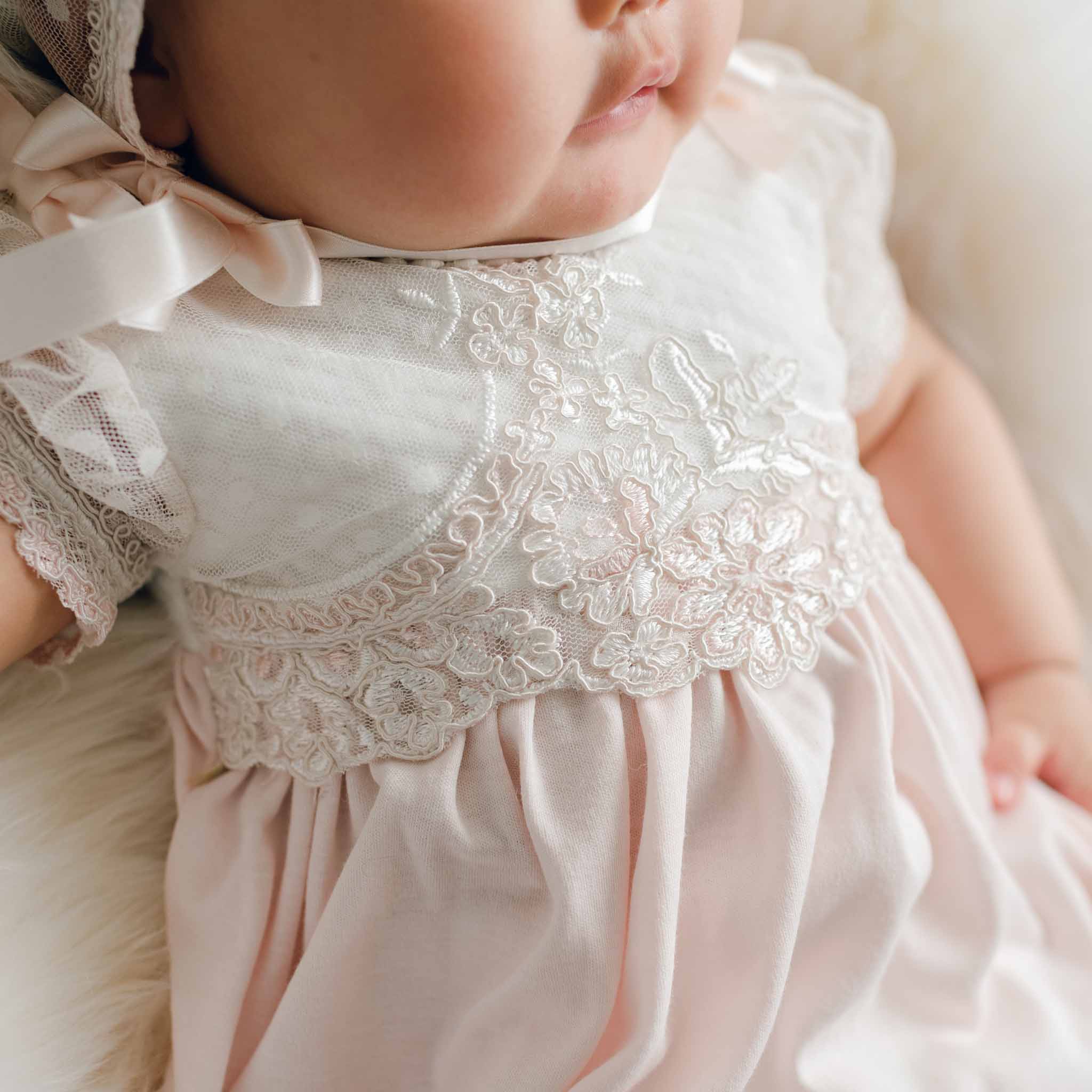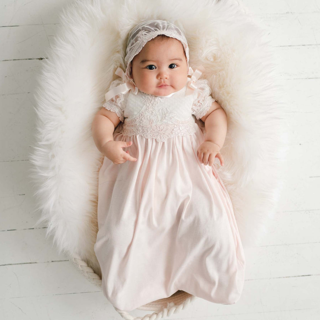 Make her coming home or newborn photoshoot perfect with this soft and cozy layette gown! Made with our Elizabeth lace and light ivory quilted cotton on the bodice, while the skirt is made with our super soft pima cotton to make sure she is comfortable the entire time she wears it! The bodice show off the beautiful and intricately detailed embroidered and corded Elizabeth lace that provides a timeless classic style! We use the same Elizabeth corded edge lace on the gathered hem of the skirt and sleeves to give her some detail from her shoulders down to her toes! Button closure on the back allows for extra easy changes. Pair with her matching Elizabeth newborn bonnet or one of our Elizabeth headbands to finish this adorable look!