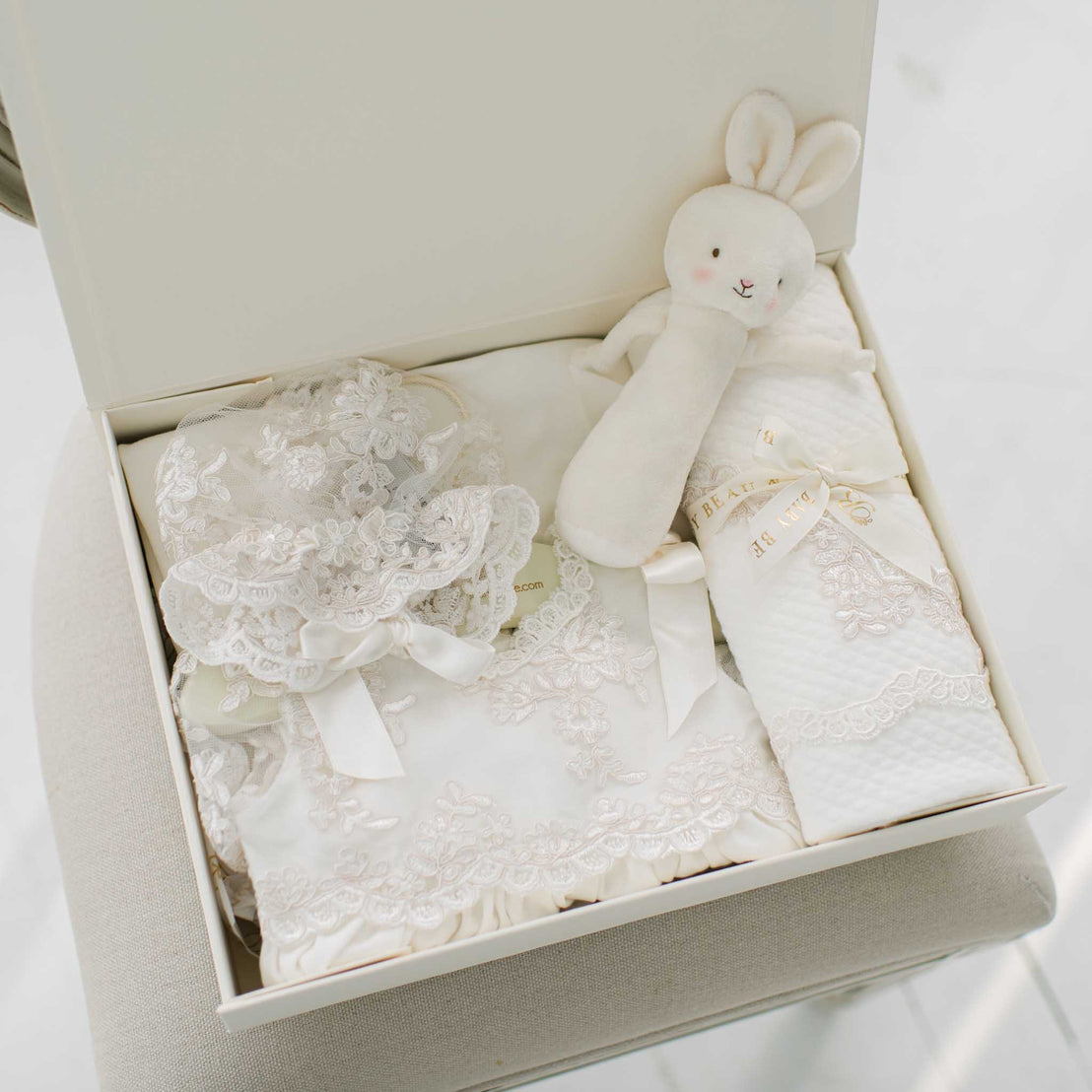 We've created this darling newborn set from our Penelope collection that would make a beautiful baby shower gift or for your little girl's special take me home outfit! The set features our Penelope Newborn Layette Gown - made with 100% ivory pima and soft linen/cotton blend and detailed with an ivory and champagne corded lace across the bodice and sleeves. Beautiful ivory edge lace detail the hem of the gown. This set also includes her matching Penelope bonnet, blanket and bunny chime. Add her first name above the lace corner of the blanket in ivory thread for a personal touch!