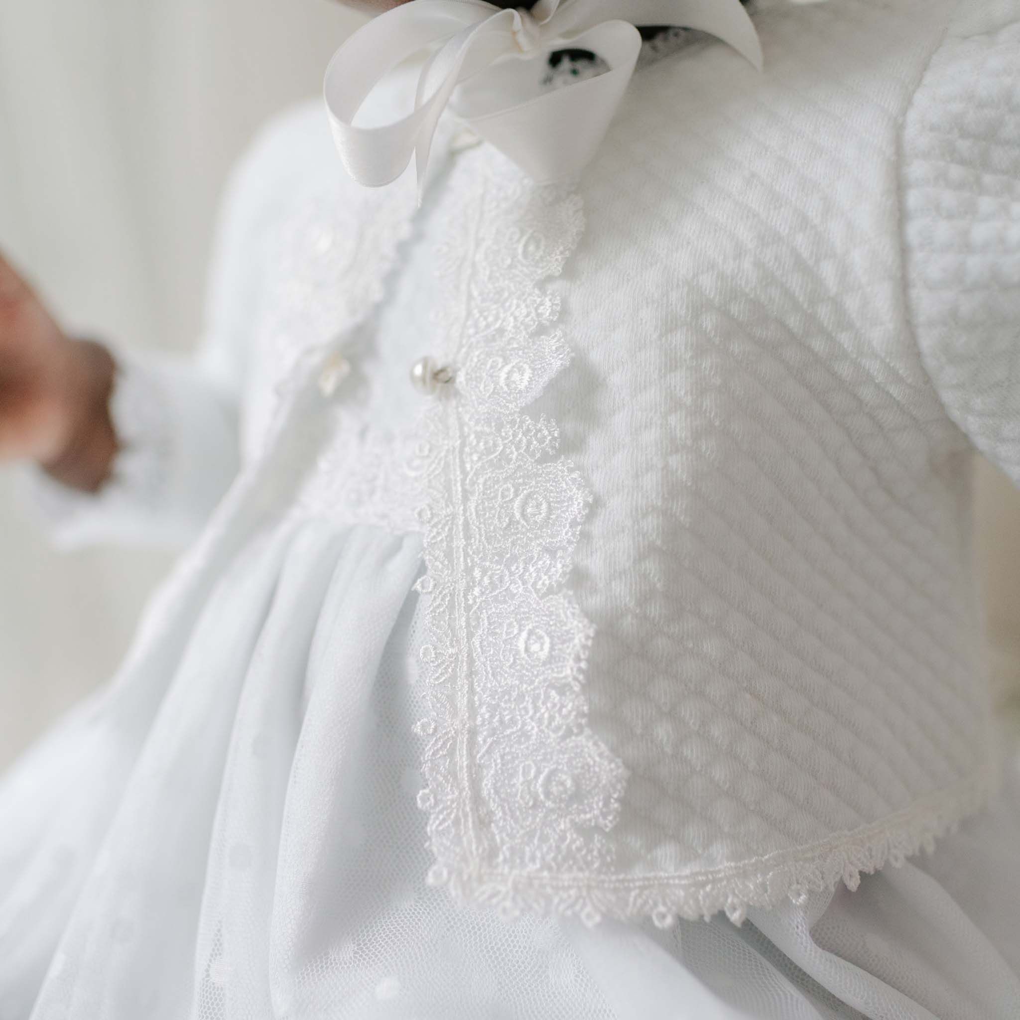 Crafted from our super soft quilted cotton in white that combines comfort and coziness. The sweater is adorned with a with detailed lace trims for a soft and delicate finishing touch. Pearl style buttons ensure a snug fit.