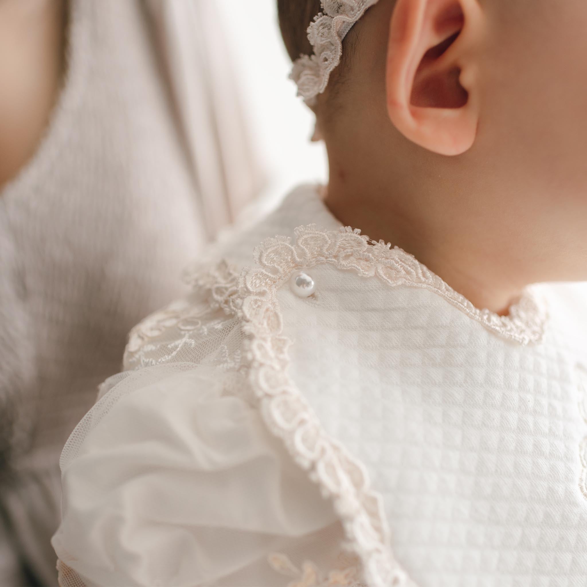 A pretty bib to match to her Kristina christening gown, or any ivory baby dress. Handmade with plush ivory quilt cotton and finished with champagne Venice lace around the edges. A cute pearl style button closure ensures a comfy fit and adds detail unique to our designer baby clothes. This beautiful accessory offers full coverage to help keep her special occasion dress safe from messes while still keeping her elegantly styled.