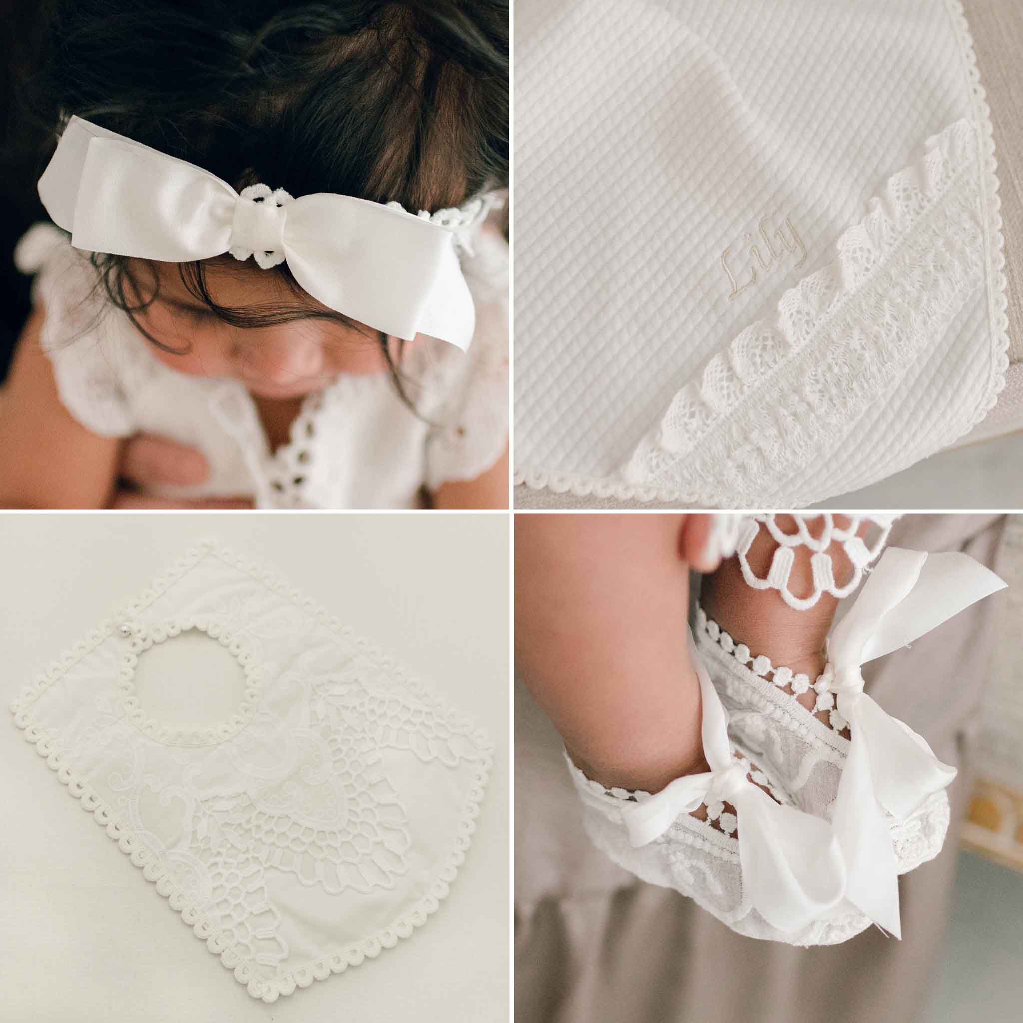 Everything needed to complete your baby girls Lily Christening gown and dress is available here in this convenient package, and at a discounted price. This Baptism accessory set includes her Ivory lace baby shoes so her designer baptism gown is perfectly styled from head to toe. It also includes her cotton lace Lily bib to protect her blessing gown from messes, and her personalized quilted blanket with her name embroidered in champagne thread on the corner for a gift she will cherish for years. The darling lace headband is perfect to switch with her bonnet for a more contemporary style at her after christening party. This set is timeless enough that it makes a perfect baby shower gift to pair with any special occasion baby dress. Save 15% over purchasing these pieces separately.