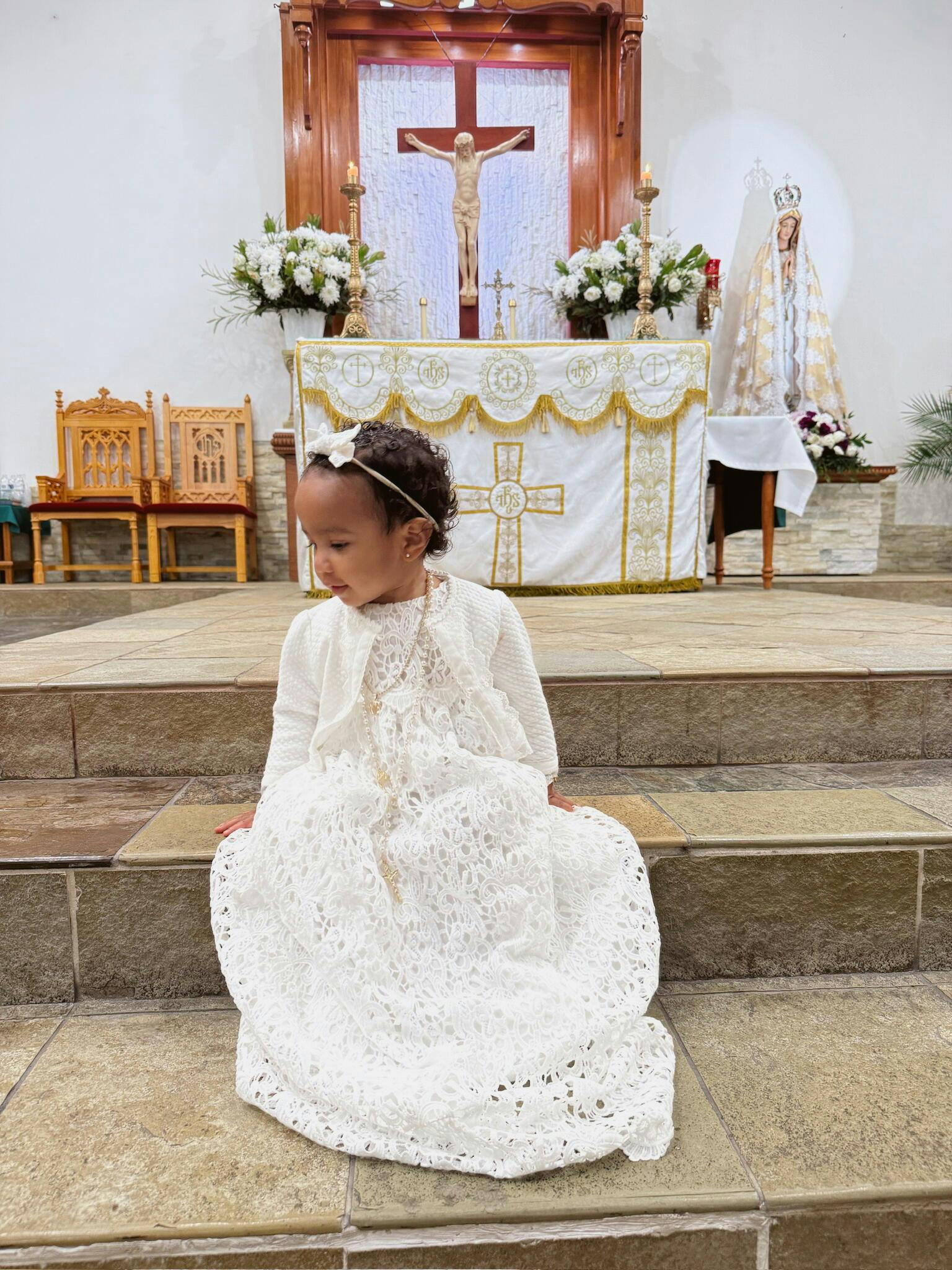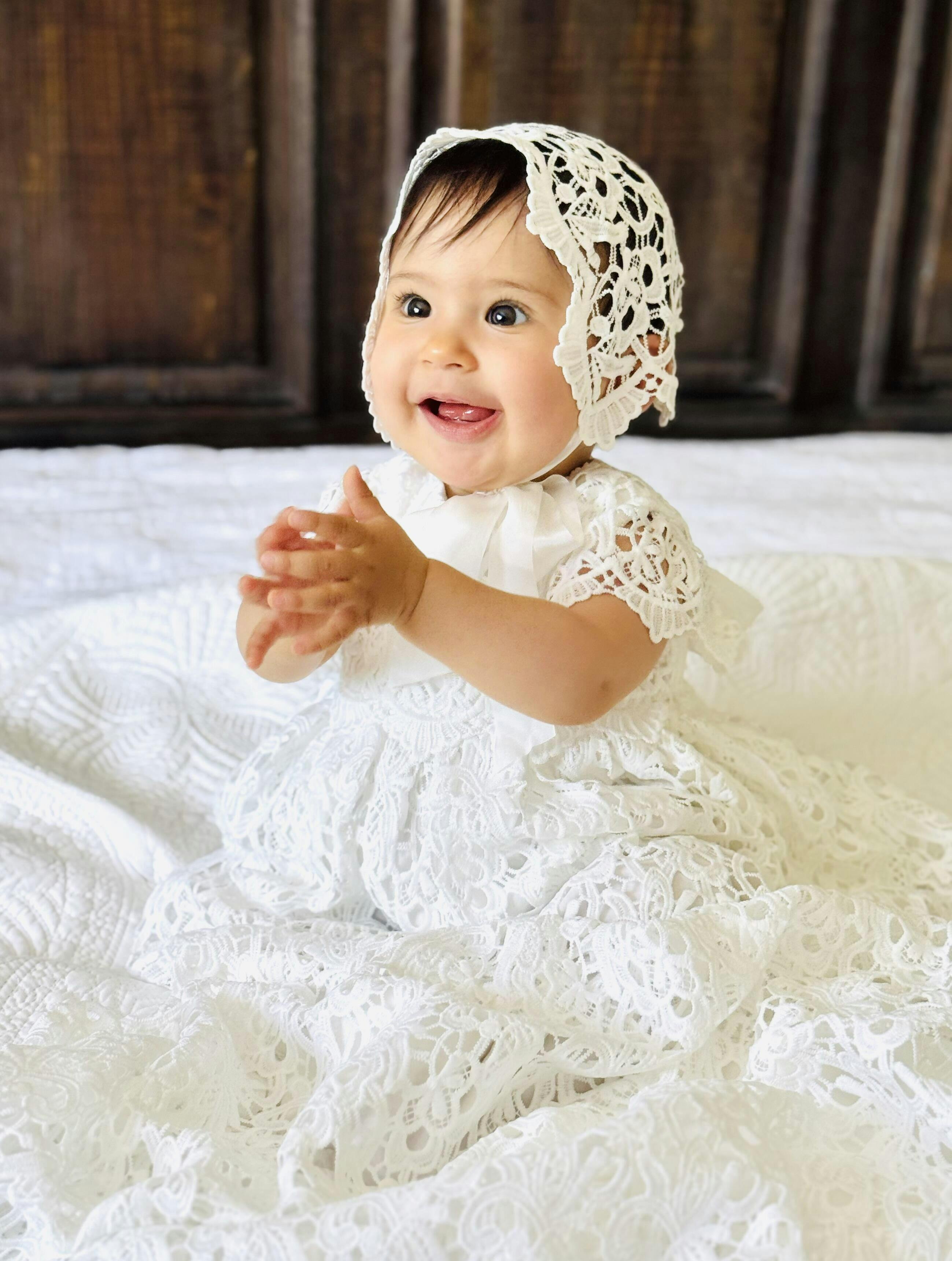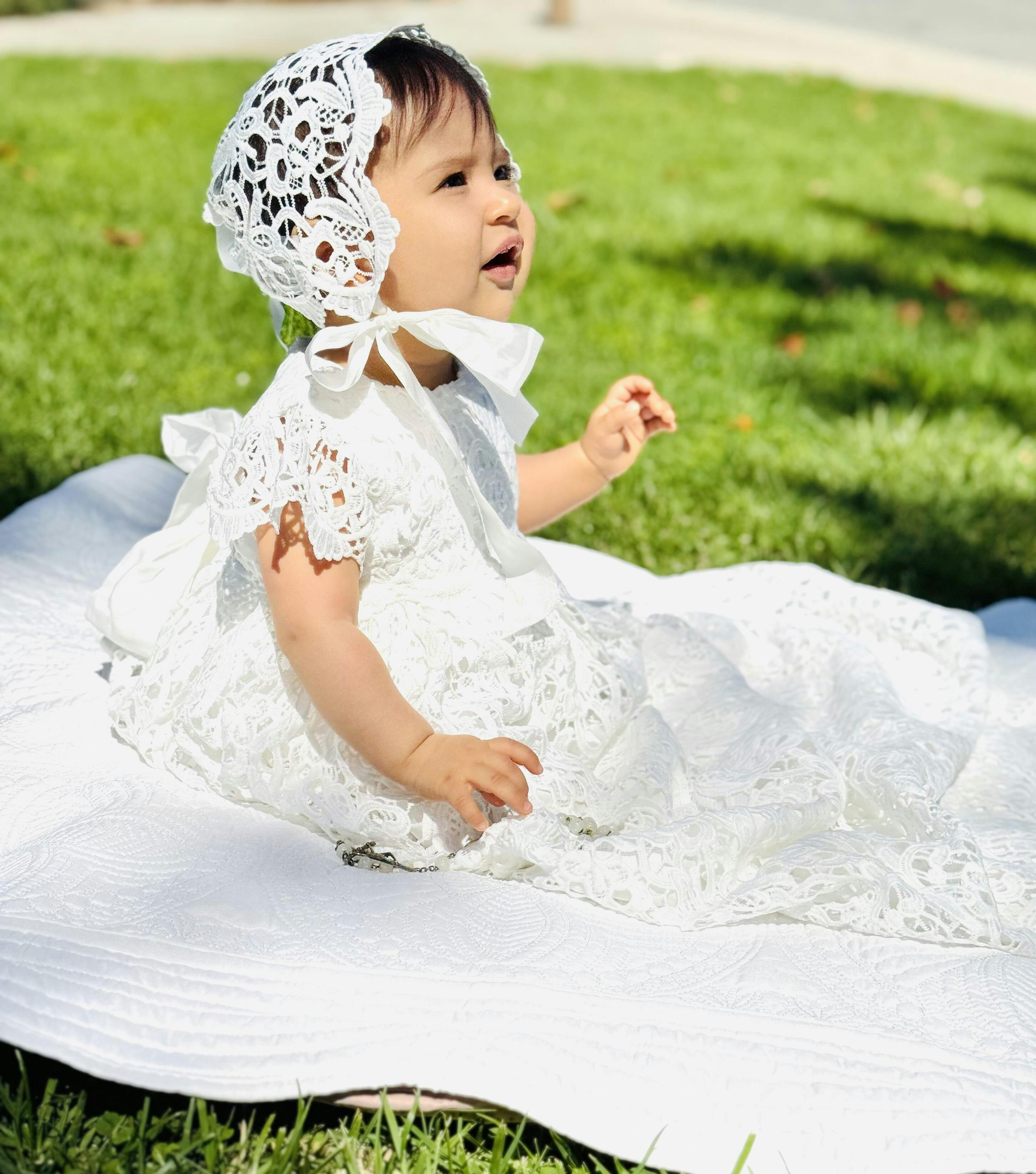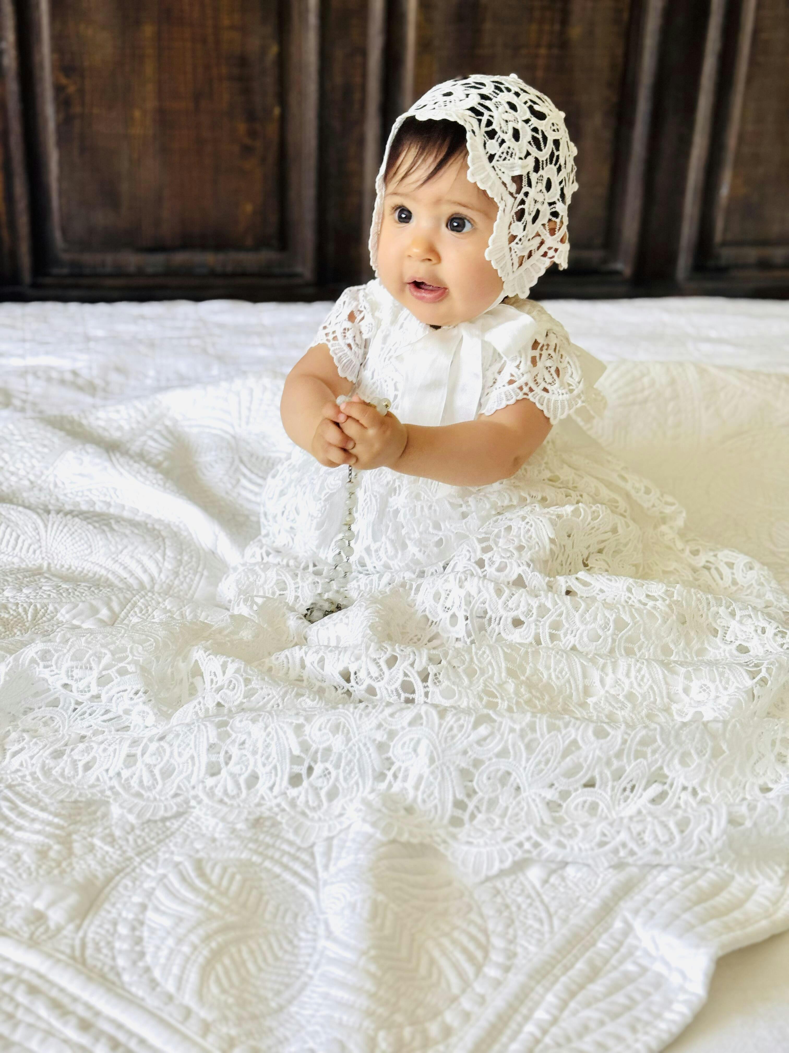 If you've been searching and wondering how to choose a christening gown, look no further. You will not find a more beautiful full-length christening gown. The Lola baptismal gown is hand-crafted down to the last detail. Made with a cotton undergown in light ivory featuring an all-over lace overlay for a detailed look not found on most gowns. Lace bodice with cap sleeves add to the uniqueness of the gown. Ties in back with a sash. Add her matching Lola lace bonnet or headband so she has her complete look. .