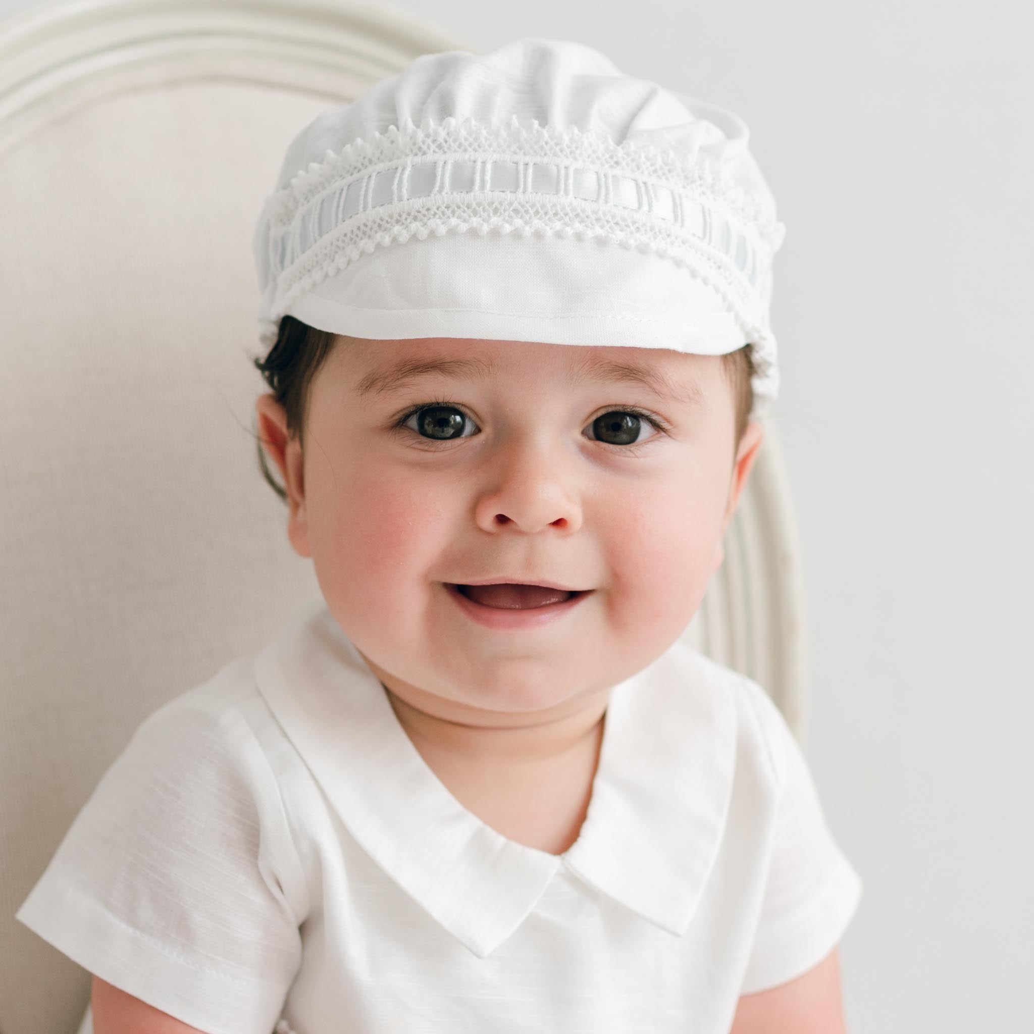 The Ethan linen hat is an elegant hat that will be the finishing touch to his Ethan bubble romper. Made with the same linen blend used to make the Ethan romper, this hat is a wonderful complement to his outfit. Featuring our elegant Venice lace and blue silk ribbon across the front for added detail. The back half of the hat features a soft elastic to ensure a snug and comfortable fit to help his hat stay with ease throughout the day.