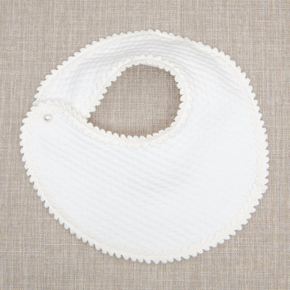This gorgeous collection must be seen and felt in person to fully appreciate its quality- the Tessa quilt baby romper is just stunning. We start out with the most snuggly quilted cotton in white, and add to that beautiful silk piping trim in a vintage pink champagne color. The addition of the ivory Venice lace collar and cuffs make this a timeless baby romper that is styled as if it was worn by previous generations for their baptisms, christenings, holiday parties, and weddings. The pearl buttons at shoulders finish the darling baby outfit, while hidden snaps at legs allow easy changes. For newborns, the pima cotton layette skirt keeps her toes perfectly covered while still looking as elegant as ever in her coming home gown.