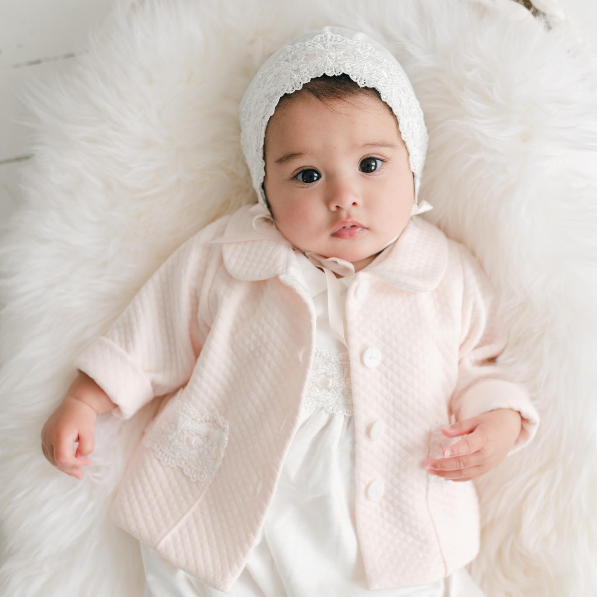A stunning trench coat to complete her look when she wears her Emma romper! Meticulously crafted with our signature quilted cotton in pink, this beautiful piece features buttons and a petite collar to make her outfit look especially chic. Charming Emma lace and ribbon detailing along the pockets is a perfect finish. With long sleeves to be rolled and cuffed for a perfectly tailored fit, this coat falls just at her mid-thigh, allowing her to move around comfortably.