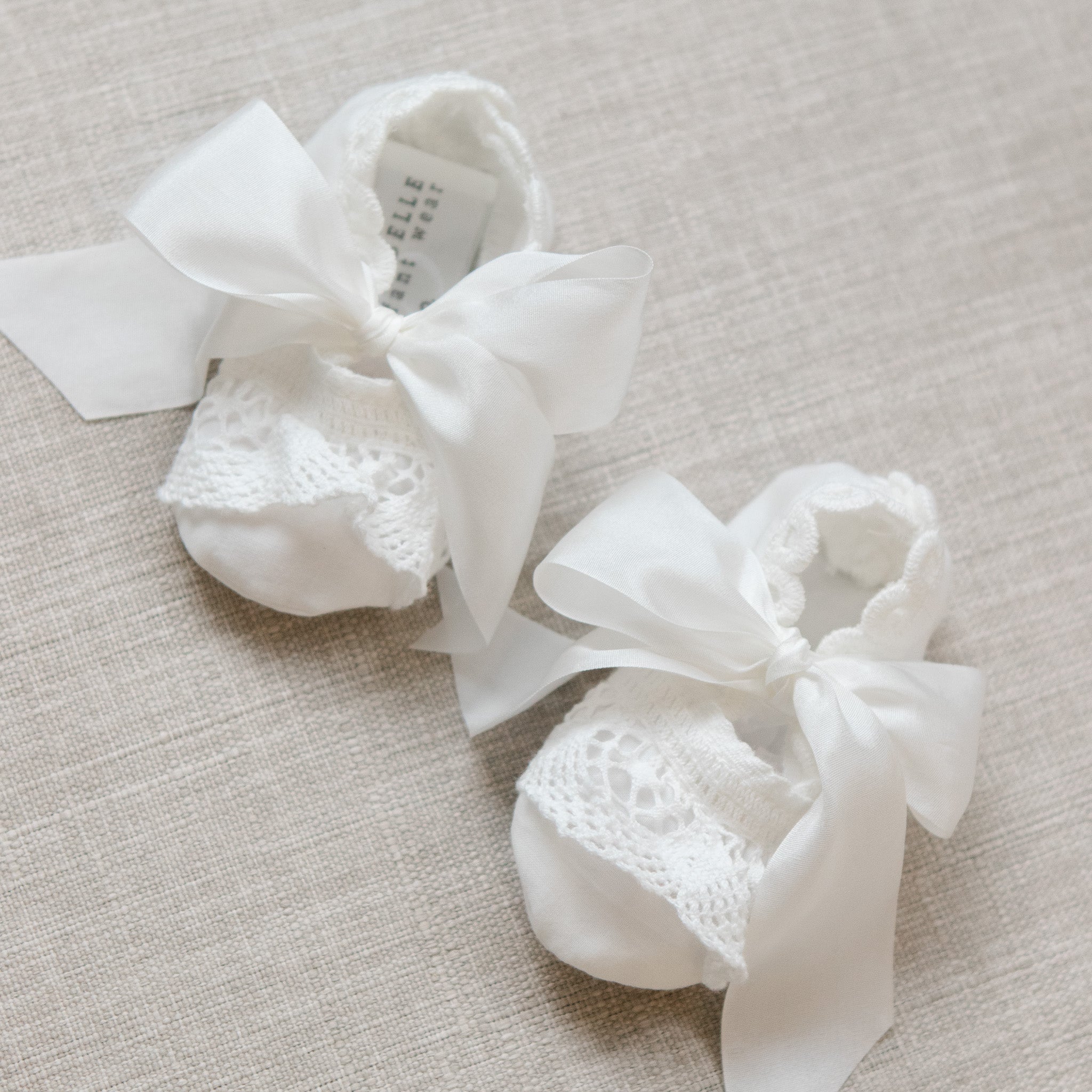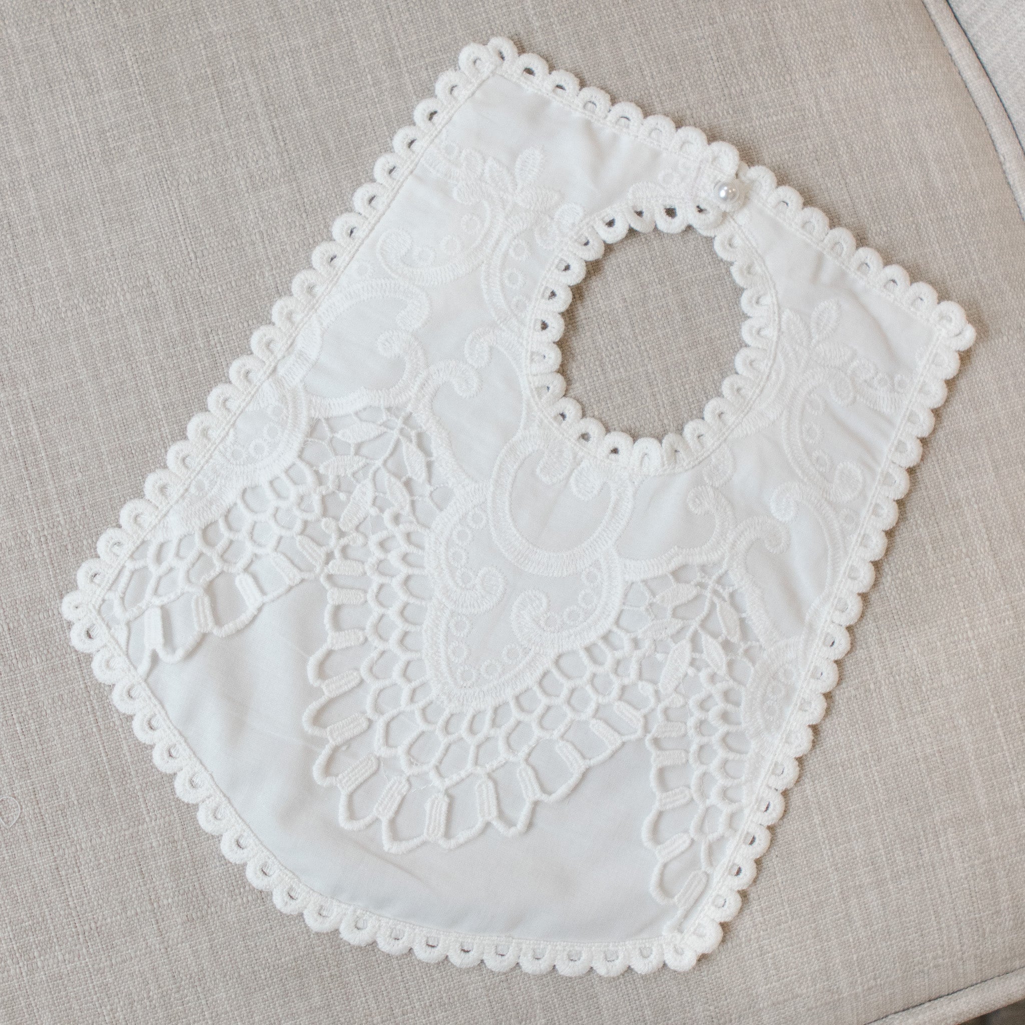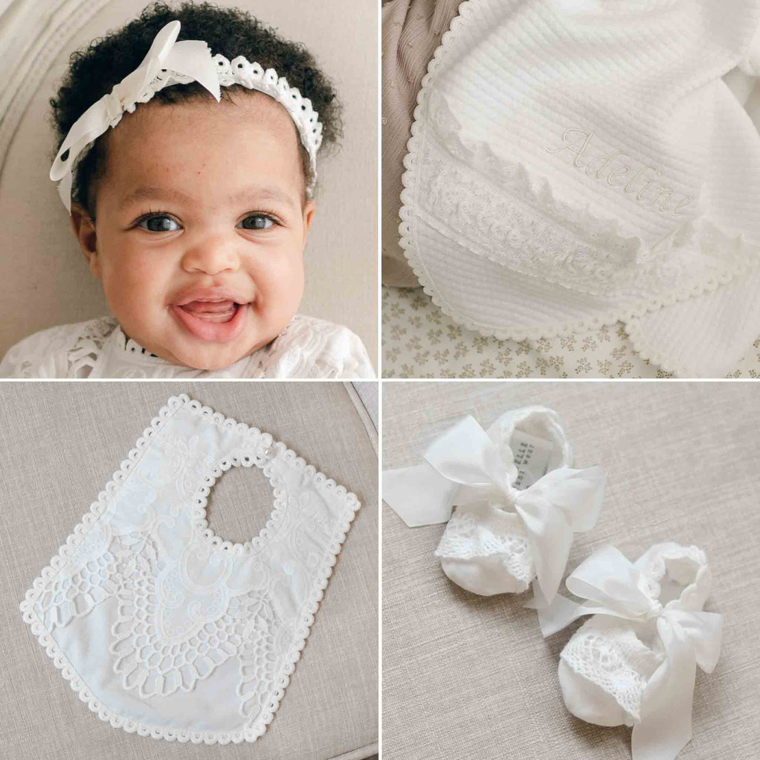 Everything needed to complete your baby girls Adeline Christening gown is available here in this convenient package, and at a discounted price. This Baptism accessory set includes her Ivory lace baby shoes so her designer baptism gown is perfectly styled from head to toe. It also includes her lace Adeline bib to protect her blessing gown from messes, and her personalized quilted blanket with her name embroidered in champagne thread on the corner for a gift she will cherish for years. The darling lace headband is perfect to switch with her bonnet for a more contemporary style at her after christening party. This set is timeless enough that it makes a perfect baby shower gift to pair with any special occasion baby dress. Save 15% over purchasing these pieces separately.