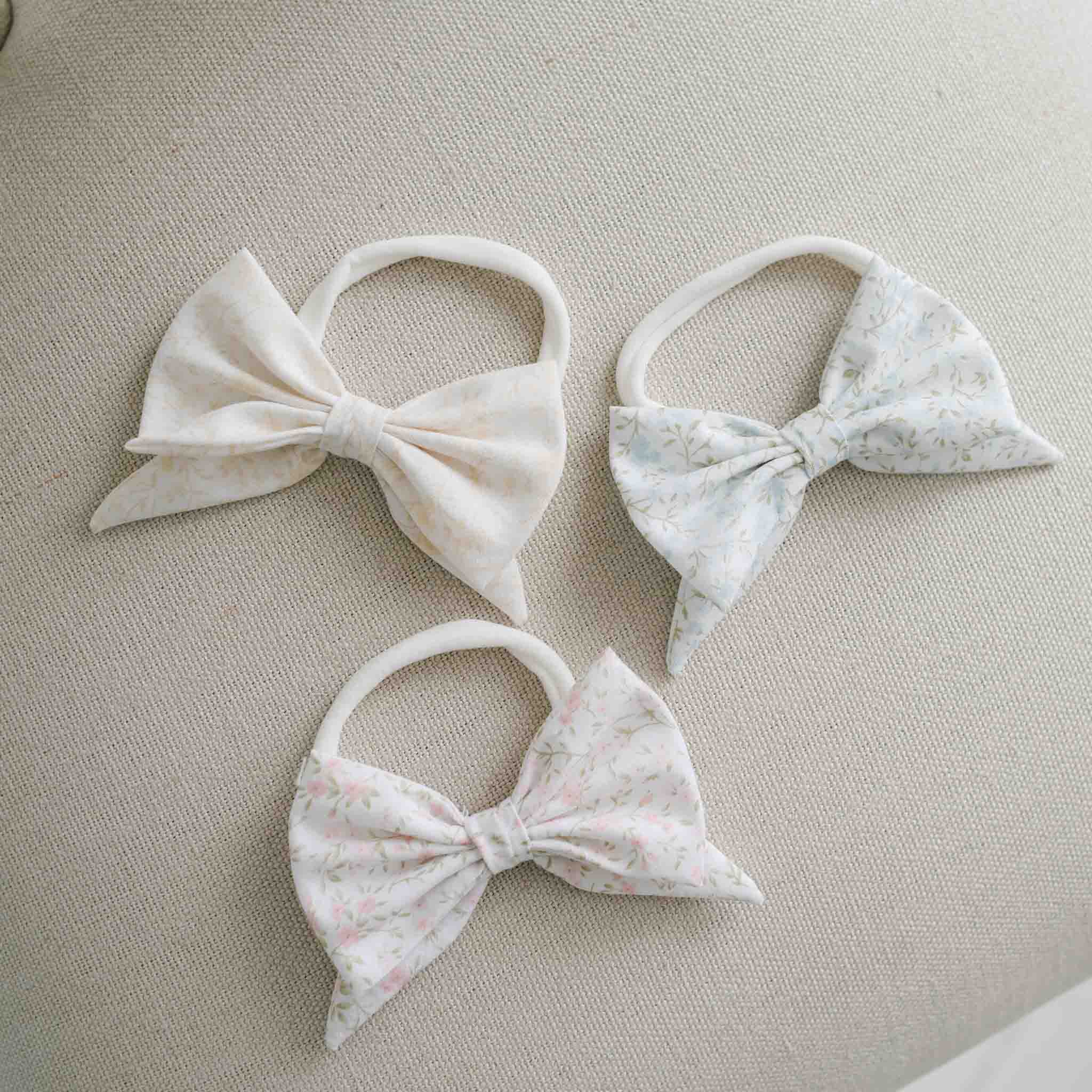 A classic cotton bow headband that will fit any little head and be a sweet finish to any outfit! Tiny flower and leaf pattern detail the bow, available in blue, pink or tan florals.