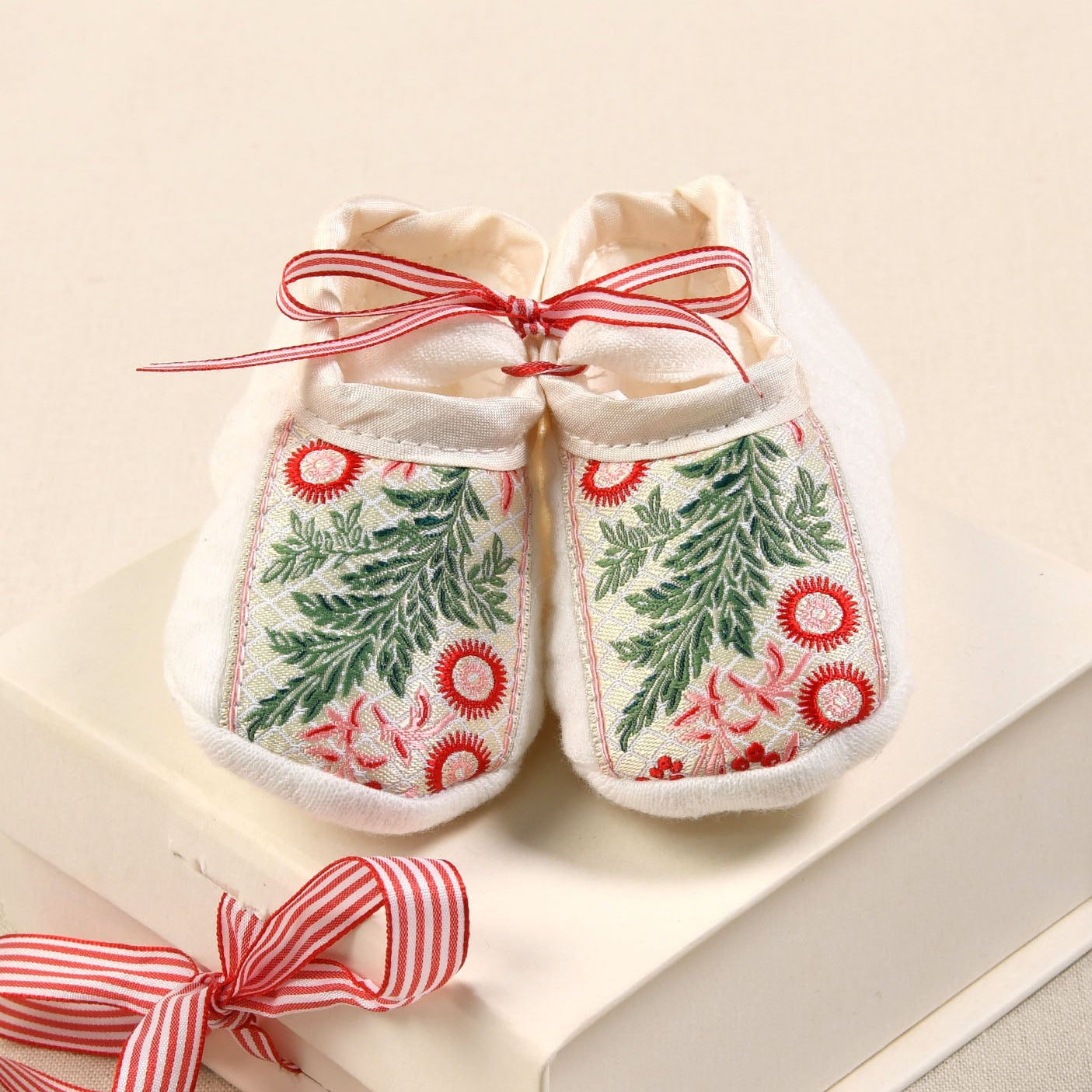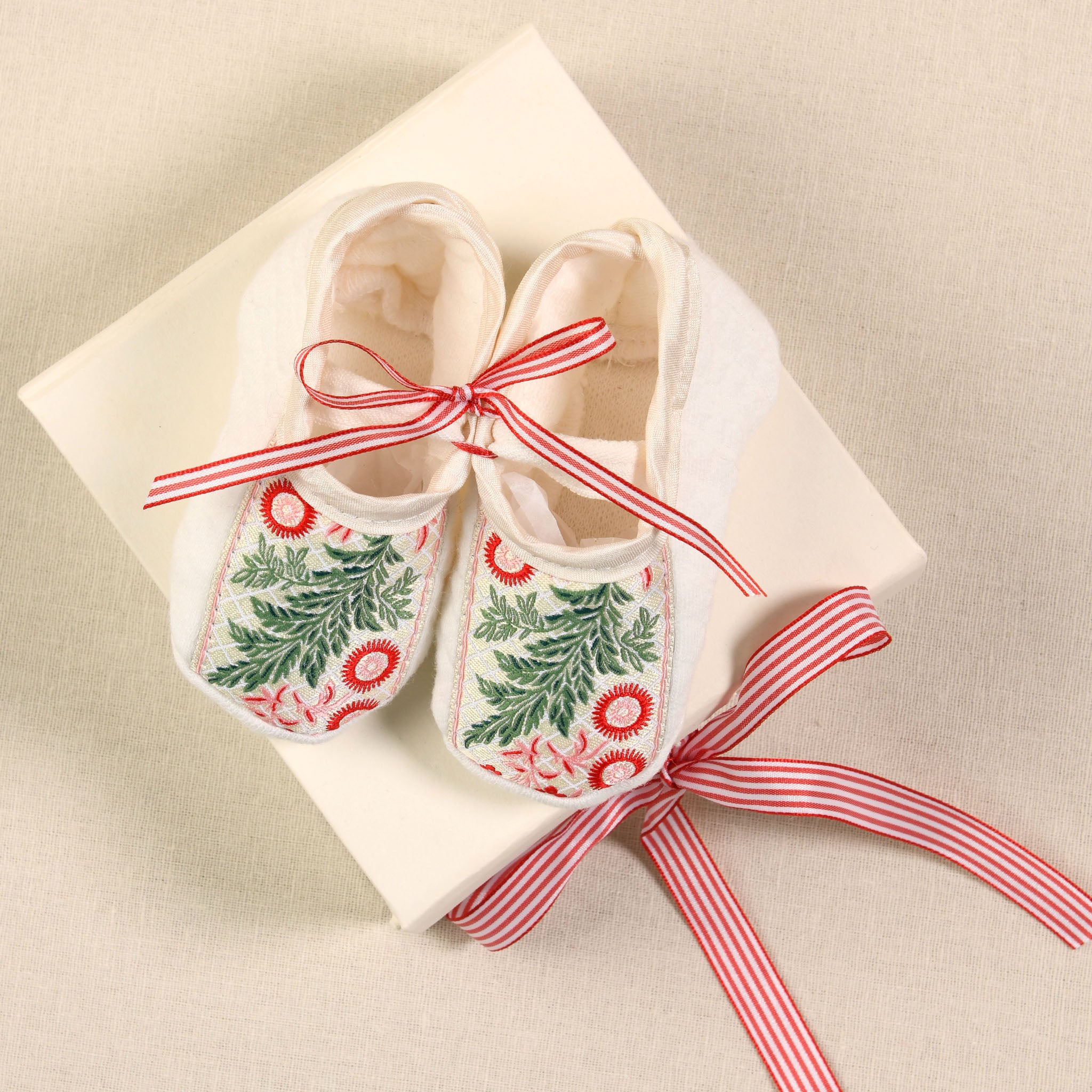 These baby booties are the perfect finishing touch to your baby’s boutique Christmas outfit. 100% cotton quilt and trimmed in natural muslin cotton, floral ribbon in red and green embellishment against an ecru damask background runs from top to toe. A soft stretch grosgrain strap across the top ensures a secure fit. This bootie can be stylishly paired with the Noelle Quilt Bonnet and Noelle Quilted Sweater to keep her perfectly matched and styled all holiday season!