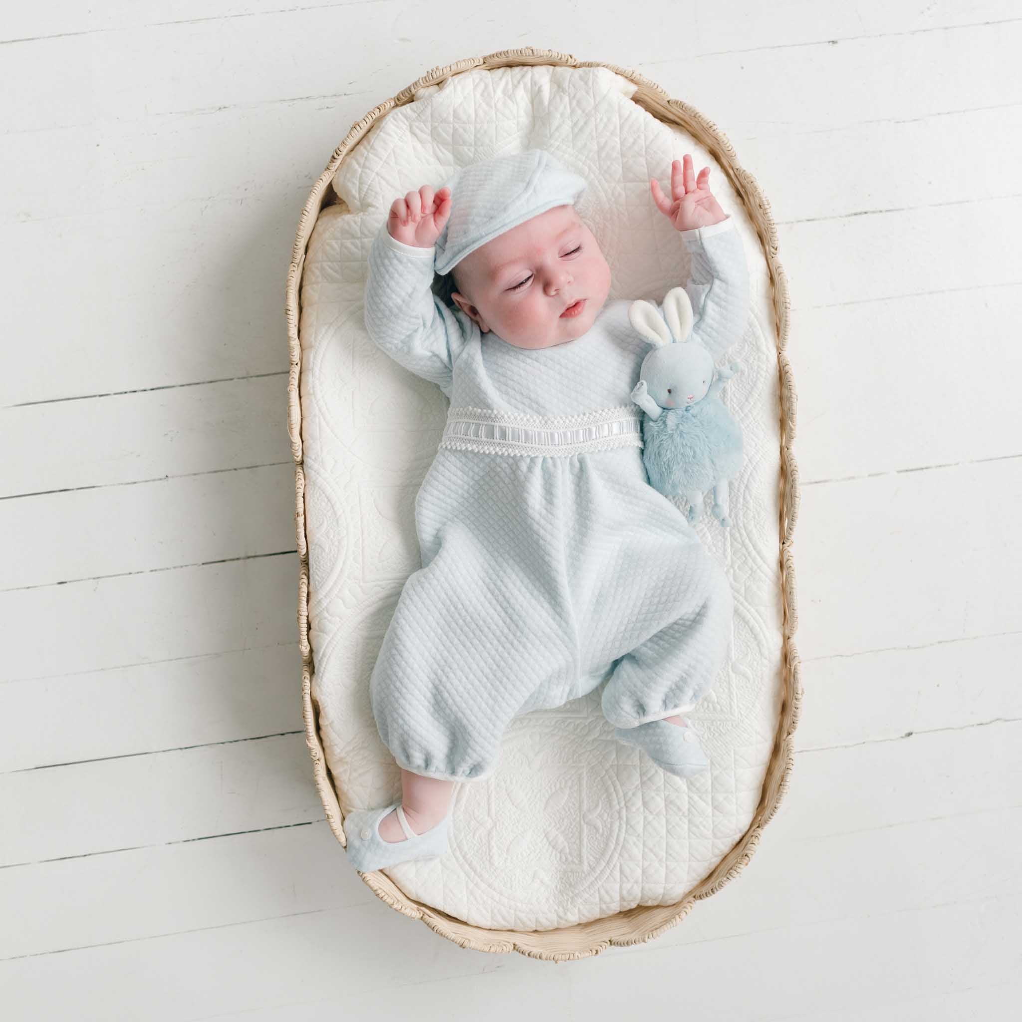 Made with the same quilted cotton used to make our Ethan romper, the Ethan quilted newsboy cap is a perfect match! The charming newsboy style baby hat is finished with a soft elastic along the back to ensure a nice, comfortable fit. Pair with the Ethan quilted booties and blanket to complete your little prince's look from head to toe!
