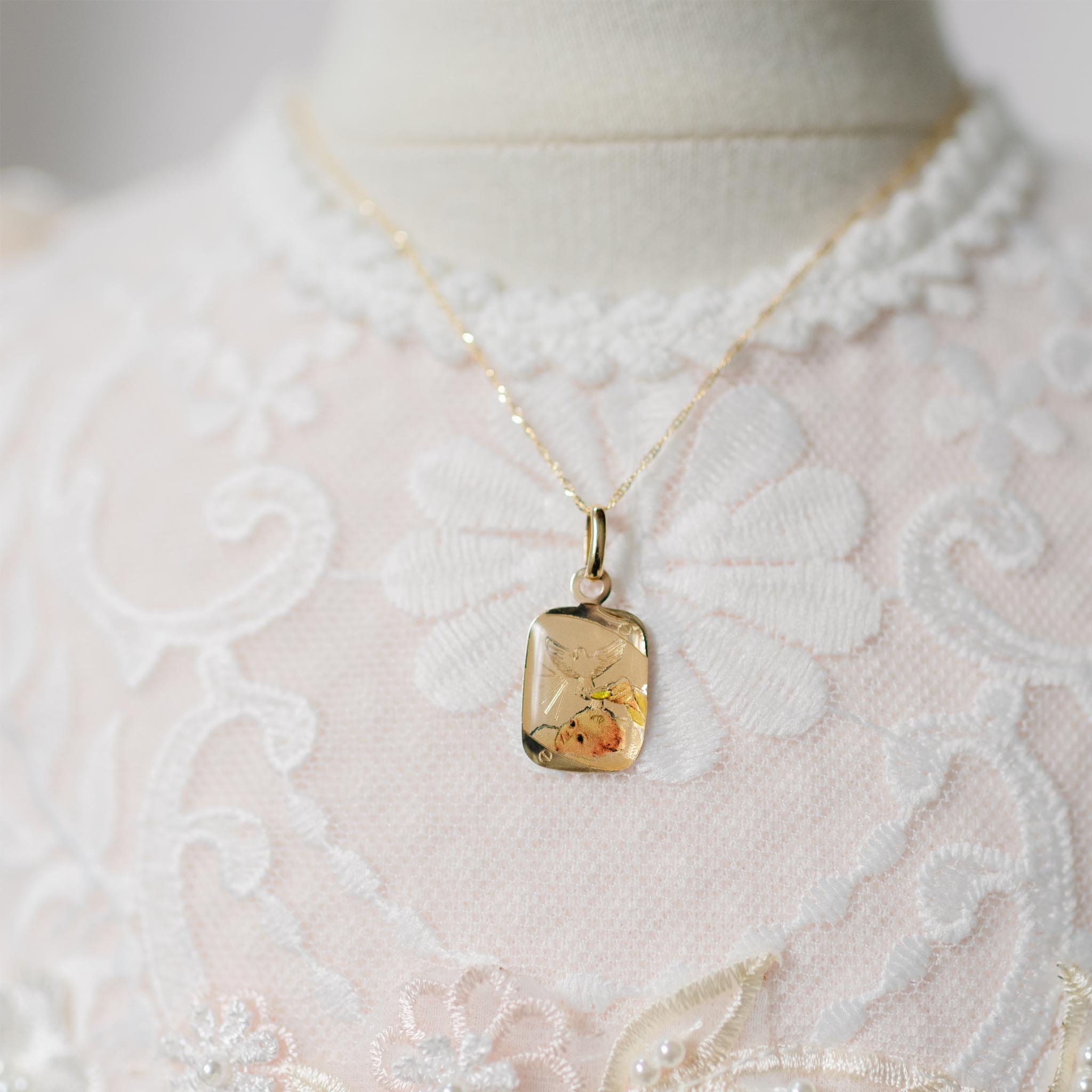A beautiful necklace for their important day! 14k solid gold rectangle etched blessing charm with a delicate 14" 14k gold chain. Charm depicts a baby being blessed and a dove soaring above, the baby and blessing hand are detailed with a touch of color to make the scene stand out. Your little one will be able to show their faith proudly with this cherished gift. A perfect addition to an already special day.