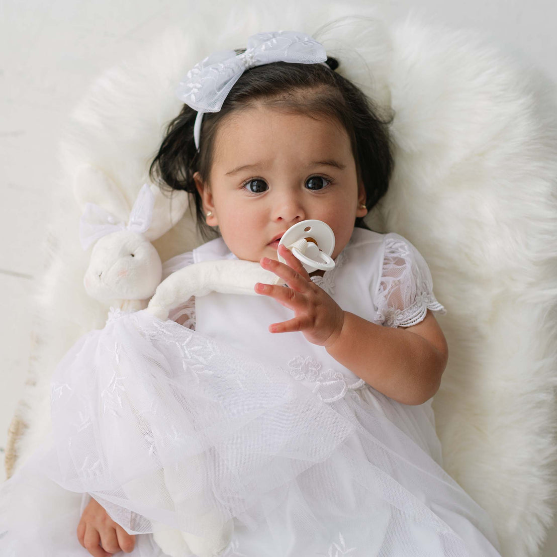 The Ellie Silly Bunny Buddy pacifier holder is the perfect way to keep baby's pacifier off the ground. It features a soft velour construction in soft white and can easily be secured to a stroller or car seat via the secure Velcro straps. The bunny also comes dressed to match the Ellie Gown or romper dress. Baby safe material ensures your little one is safe.