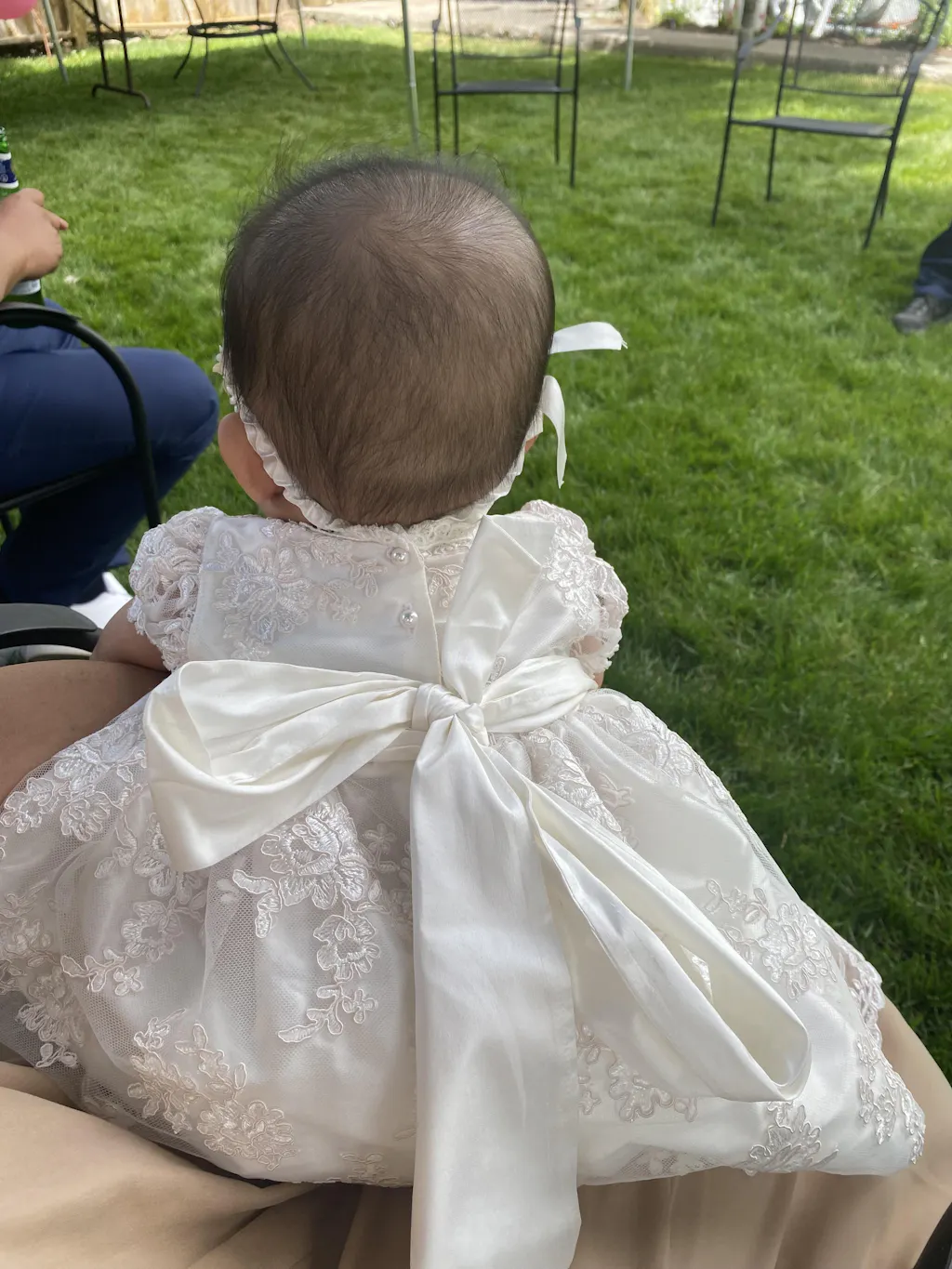 Our Penelope lace dress is an exquisite option for any special occasion that calls for a beautiful silk and lace baby dress! The Penelope dress is handmade in 100% single layer dupioni silk in a gorgeous shade of ivory. Featuring our stunning Penelope embroidered netting lace with a beautiful floral pattern. The embroidered flowers are ivory with champagne cording adding depth and detail unique to our designer baby clothes. Pearl style buttons in the back add pretty vintage accents and make it easy to change her into her dress. An ivory flower applique at the neckline along with gathered cap sleeves finish the timeless look. So pretty, she will be ready for her christening day, blessing day, for use as a flower girl dress, or her first birthday.