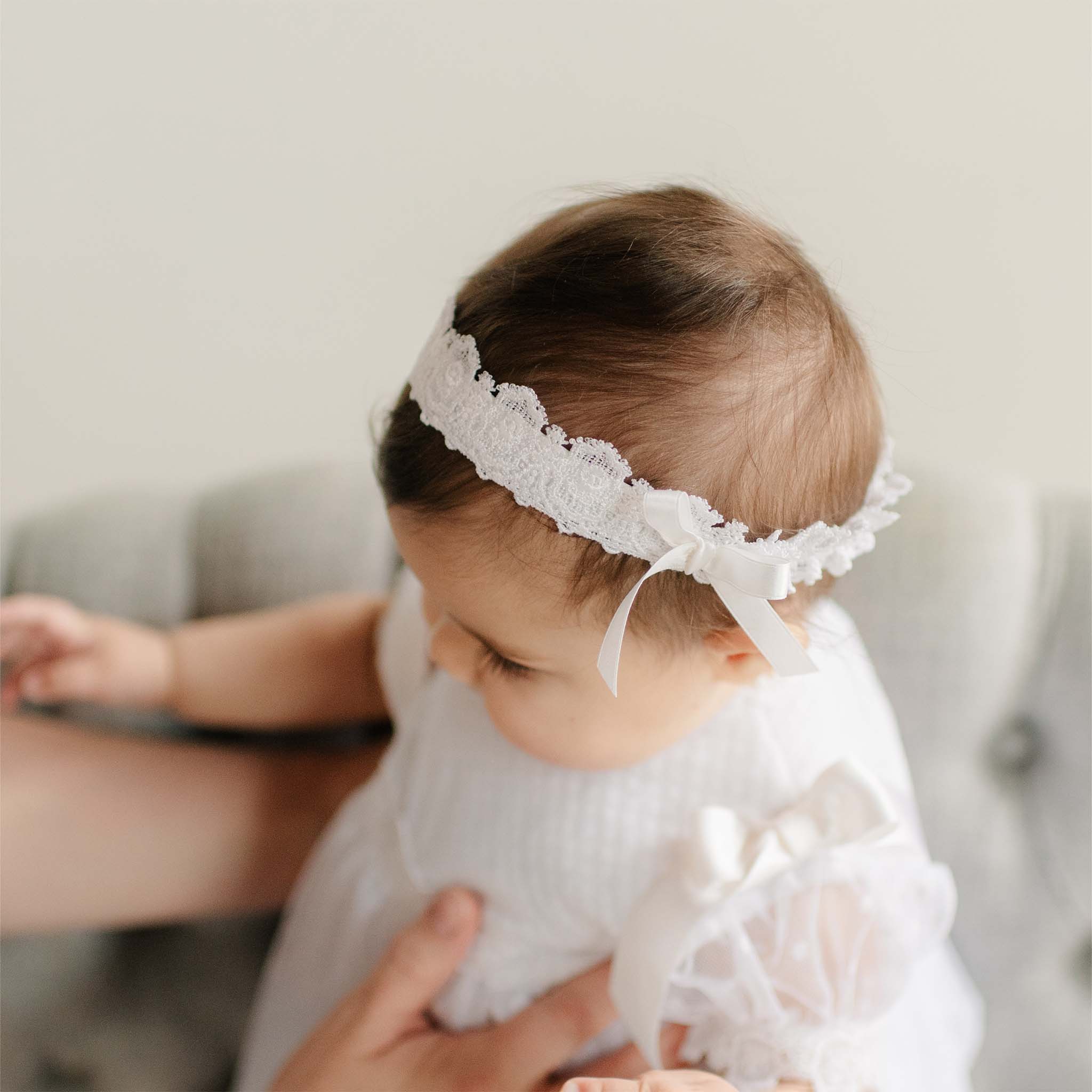 This beautiful headband completes any outfit for your little one or will be the perfect addition to your Stella collection. Super soft elastic all the way around so it stretches for a custom fit. Elastic is covered in the front with white Venice lace and a silk ribbon bow. This headband makes your Stella outfit dress or layette more adorable.